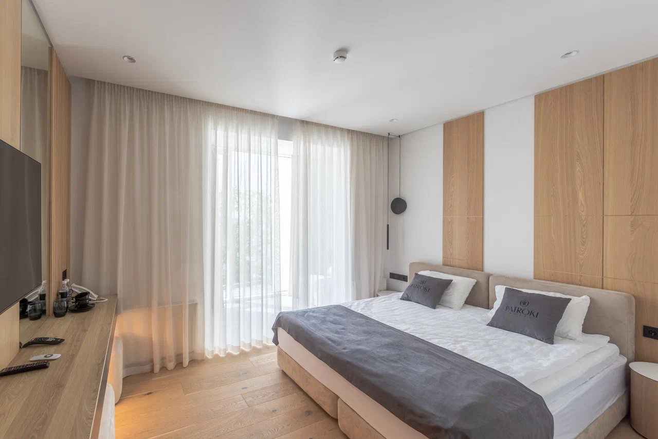 Номер категории люкс с видом на море. Состоит из двух комнат, зона отдыха от спальной зоны отделена стеклянной перегородкой. В номере есть кондиционер. телевизор, чайник, холодильник с мини-баром, собственная ванная комната.